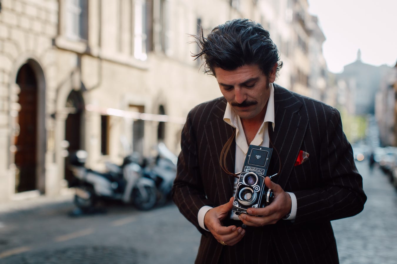 Well, this was the way I put it to the friend who asked; he’s like an Italian Indiana Jones meets Tom Selleck with an equally mighty moustache, who also rides horses… and menswear, lots of menswear.